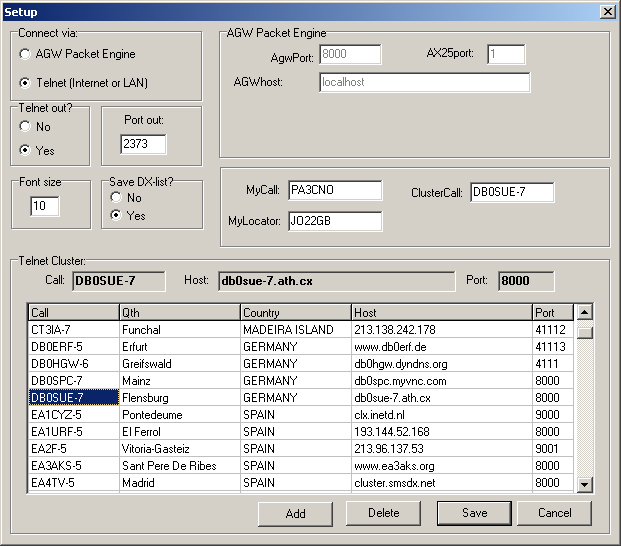 Wat je in moet vullen, is je call en QTH-locator. Verder moet je kiezen met welke node je wilt verbinden. Ik heb zelf gekozen voor DB0SUE-7 omdat daar geen wachtwoord voor nodig is. Nadat je alle gegevens ingevuld hebt, kan je op "connect" drukken om verbinding te maken met het cluster.