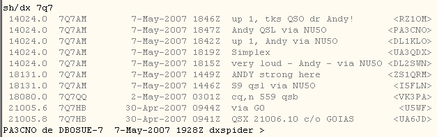 Je ziet nu de laatste 10 DX meldingen verschijnen. Maar stel dat je naar een speciaal station op zoek bent. Dan kun je een deel van de call opgeven. In mijn geval werkte ik Malawi (7Q7AM). Het opvragen van de laatste 10 DX-meldingen van dit station gaat als volgt: