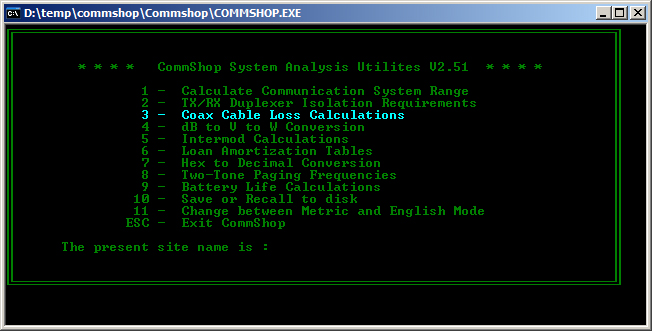 Zoals je ziet stamt het programma nog uit het DOS tijdperk. Desalniettemin zijn veel van de mogelijkheden nog steeds van toepassing. Het gaat ons uiteraard om optie 3, de coax verliesberekeningen. Maar het programma beschikt over nog meer leuke toepassingen, zoals conversies, intermodulatieberekeningen, dubbeltoon frequenties, levensduur van een accu bij een gespecificeerde belasting en zelfs hypotheekberekeningen….