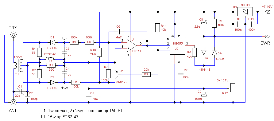 Het schema van de zelfrekenende SWR-meter is enigzins aangepast, en dat levert het volgende resultaat op: