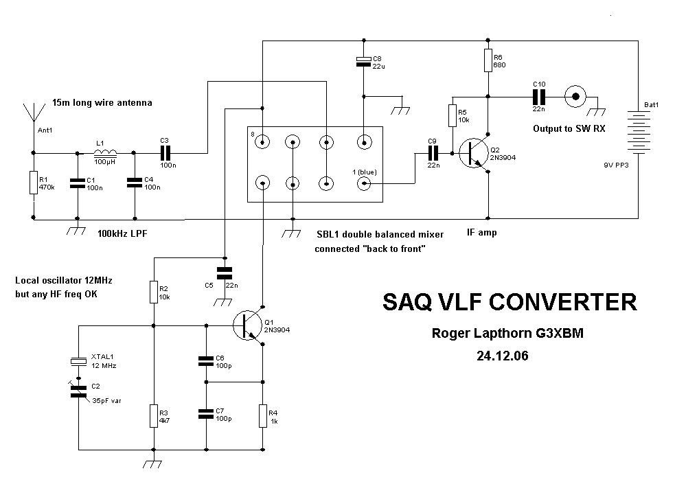 De converter werd gebouwd voor gebruik met een FT817, maar werkt met de meeste kortegolf ontvangers. Het circuit bestaat uit een laagdoorlaatfilter dat met een SBL1 dubbelgebalanceerde mixer verbonden is die "achterstevoren" gebruikt wordt met de middenfrequent poort als de HF input, een 12MHz kristal local oscillator, een 2N2904 MF voorversterker waarvan de uitgang op 12.0172MHz (12MHz + 17.2kHz) aan de FT817 toegevoerd wordt, die weer in CW mode staat. Natuurlijk kan de keuze van het kristal afhangen van wat je in je junk box hebt. De converter werkt redelijk goed van een paar kiloherz tot ongeveer 100kHz. Voor de antenne werd de gebruikelijke draad van willekeurige lengte gebruikt die de auteur door de tuin heeft gespannen, welke afgestemd werd met de centrale verwarming als aarde.