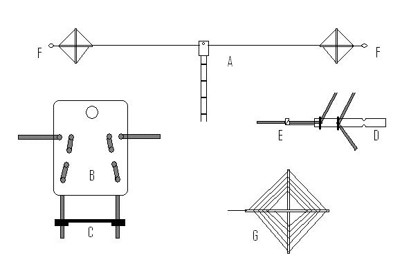 De antenne is gemaakt van 30 meter tweeling snoer, dat na het splitsen door een voorgeboord kunststof snijplankje getrokken wordt, totdat er aan een kant 10 meter draad zit en aan de andere kant 20 meter ( B ).