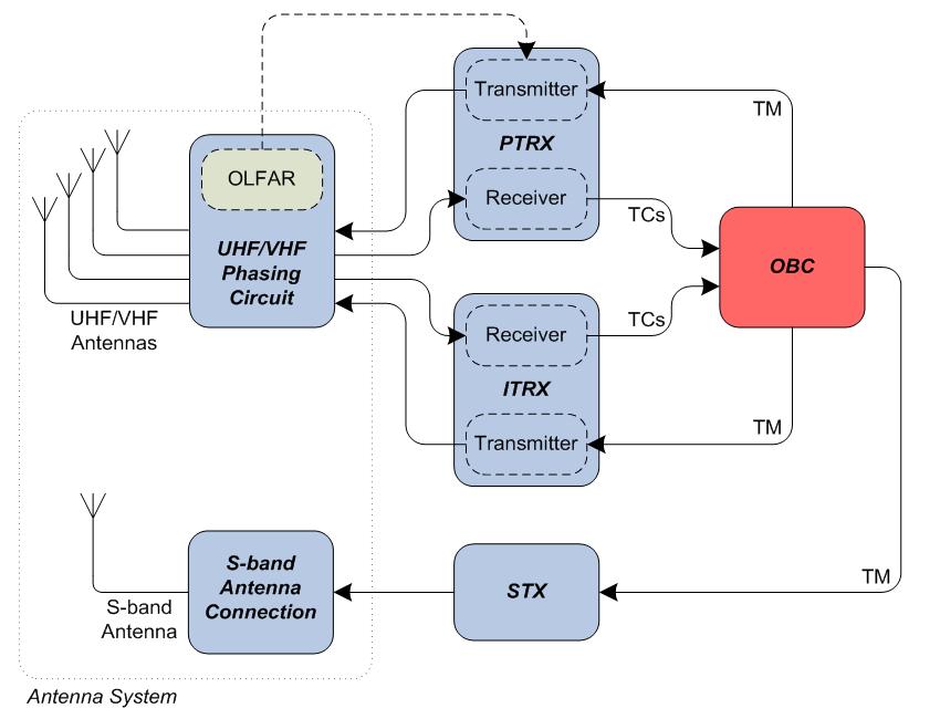 The communications subsystem (COMMS) of Delfi-Next consists of three radios, a phasing circuit and antennae. Below is figure that provides an overview of the elements and interfaces of the COMMS. The primary transceiver (PTRX) is the radio used for nominal operations. The second radio is the ITRX which is a payload but also acts as back-up radio for the PTRX. They both use the same phasing and antenna circuit. The third radio is an S-band transmitter using its own antenna. This radio is experimental and will be used to test an end-to-end link for relatively high data rates