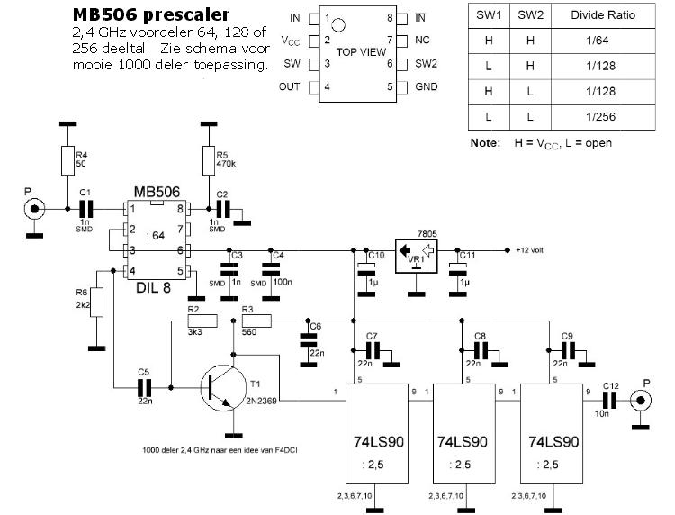 F4DCI heeft een tamelijk eenvoudige pre-scaler ontworpen. De pre-scaler is in staat de frequentie van signalen tot ongeveer 2,4 GHz door 1000 te delen zodat een eenvoudige frequentieteller hiermee uit de voeten kan. Origineel is dat er van 3 2,5 delers gebruik is gemaakt.