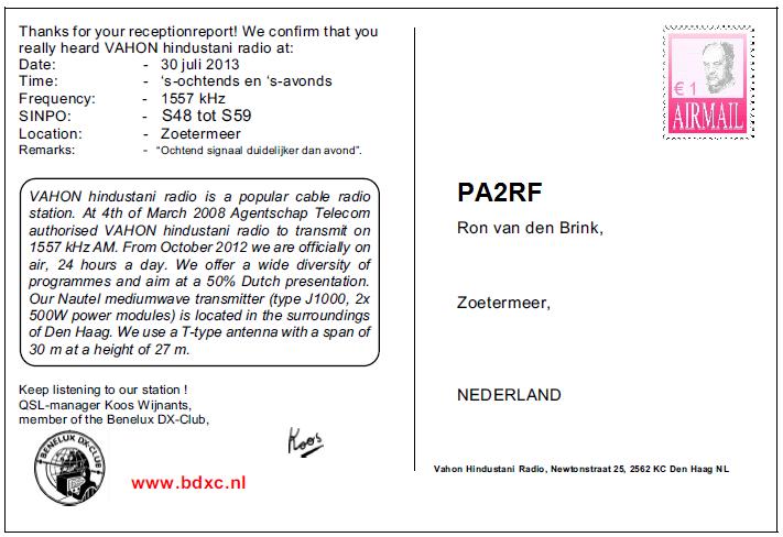 Getriggerd door het laatste nummer van de Electron stemde ik afgelopen donderdag af op de middengolf 1557 kHz AM. Hier was VAHON prima te horen. VAHON verzorgt radio programma's voor de Surinaams-Hindoestaanse bevolkingsgroep in de regio op de kabel in Den Haag (99,8 MHz) en sinds 16 oktober 2012 ook op 1557 kHz.
