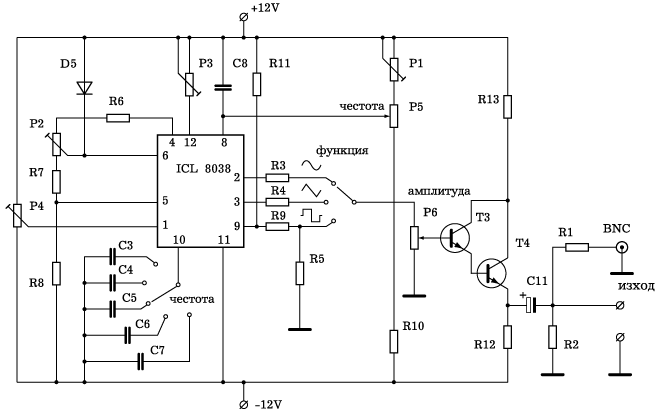 De schakeling is opgebouwd rond een al wat ouder IC: de ICL8038 van Intersel. Dit IC is voor onder de 3 euro te koop bij Kent. Er zijn ook schakelingen met deze chip in omloop die de sweep en FM functie van dit IC gebruiken.