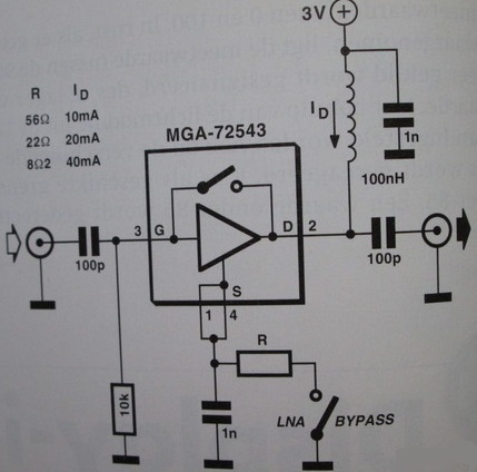 Omdat de MGA-72543 in principe uit een GaAs-FET-trap bestaat, moet men de ingang (gate) en de uitgang (drain) via gelijkspanning zo instellen dat de gewenste voedingsstroom ontstaat. Dit kan men met een negatieve gate voorspanning doen. In de schakeling hier wordt het eenvoudiger opgelost; er is een source weerstand toegevoegd.